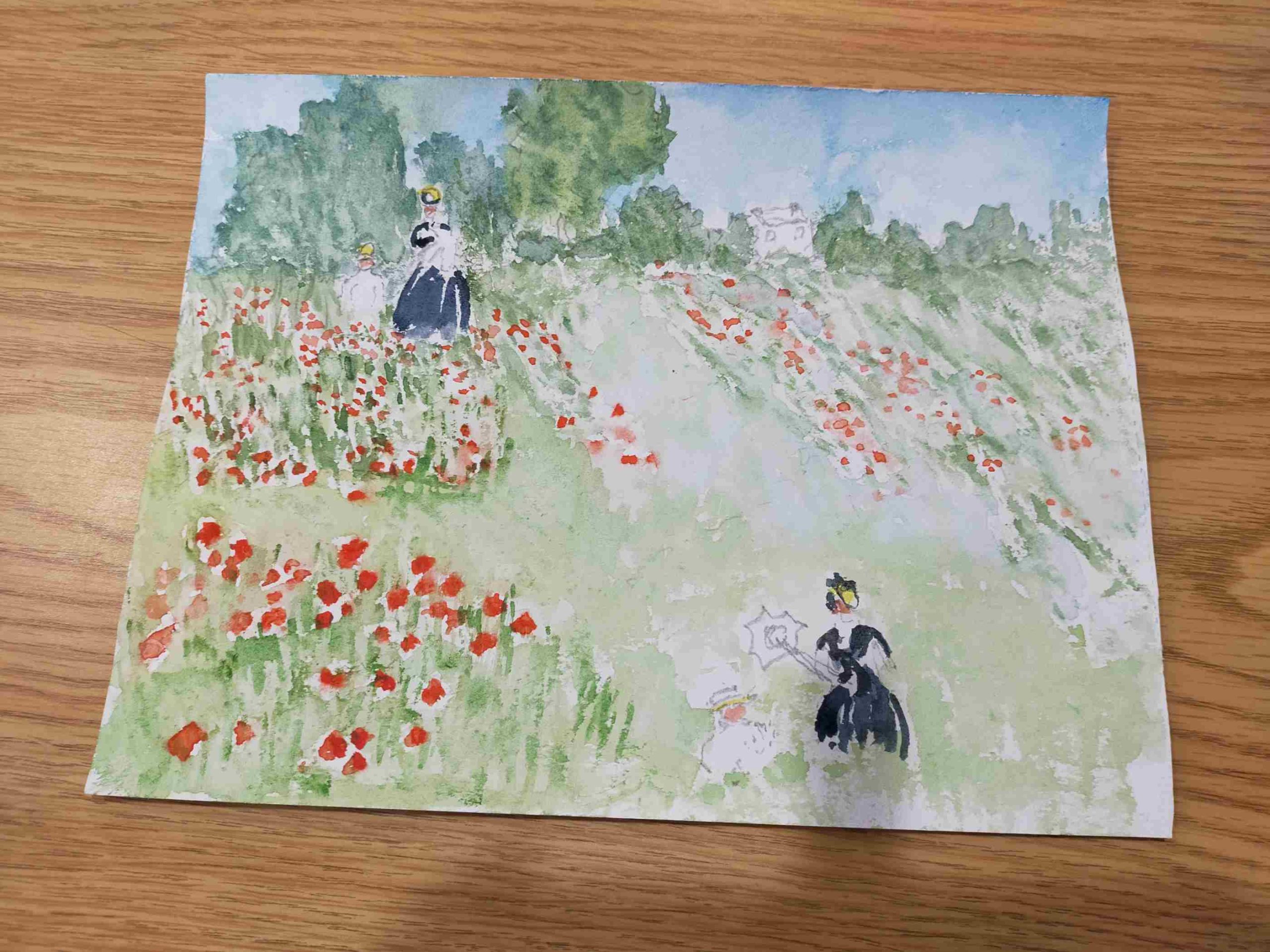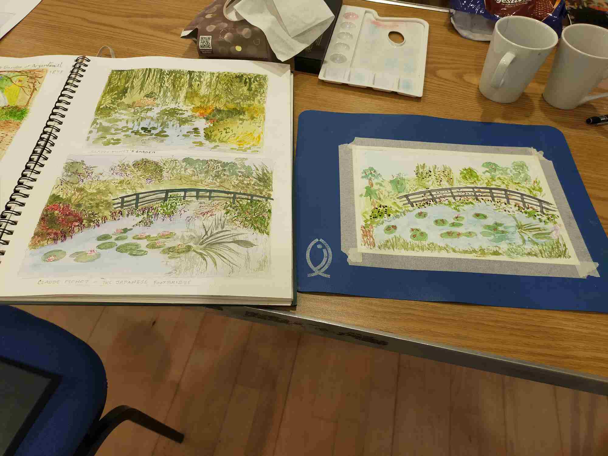 Art Group – Last month Joan gave us a fascinating talk about Monet and the Impressionists, and this month we all had a go at copying some of their work, inspired by the wonderful book that Joan put together with her copies of their work. Some chose watercolours, some chose acrylics but we did enjoy the simplicity of this style of painting.